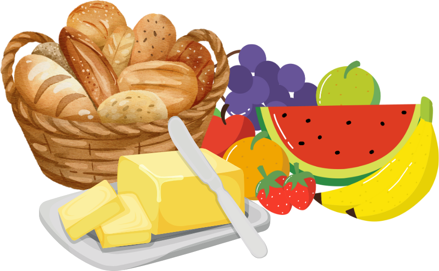 Brød kan fx være rugbrød, boller eller franskbrød, og smør kan være almindeligt smør eller plantemargarine.